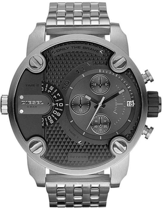 Astetta rajumpi Diesel Little Daddy DZ7259 kello on tarkoitettu tosimiehille. Diesel Little Daddy on massiivisen Mr. Daddy kellon pikkuveli, ja sopii paremmin kaikenkokoisiin ranteisiin. Kellon runko on leveydeltään 51mm, ja nuppien kanssa 60mm. Rannekkeen leveys on 24mm.Kello voidaan asettaa käymään kahden eri aikavyöhykkeen aikaa yhtäaikaisesti sillä kellossa on 2erillistä kelloa! Little Daddy kellosta löytyy myös ajanotto-ominaisuus eli kronografi sekä päivyri.Tuote toimitetaan valmistajan alkuperäisessä rasiassa postikuluitta. Kaikille Diesel kelloille myönnetään kahden vuoden takuu.