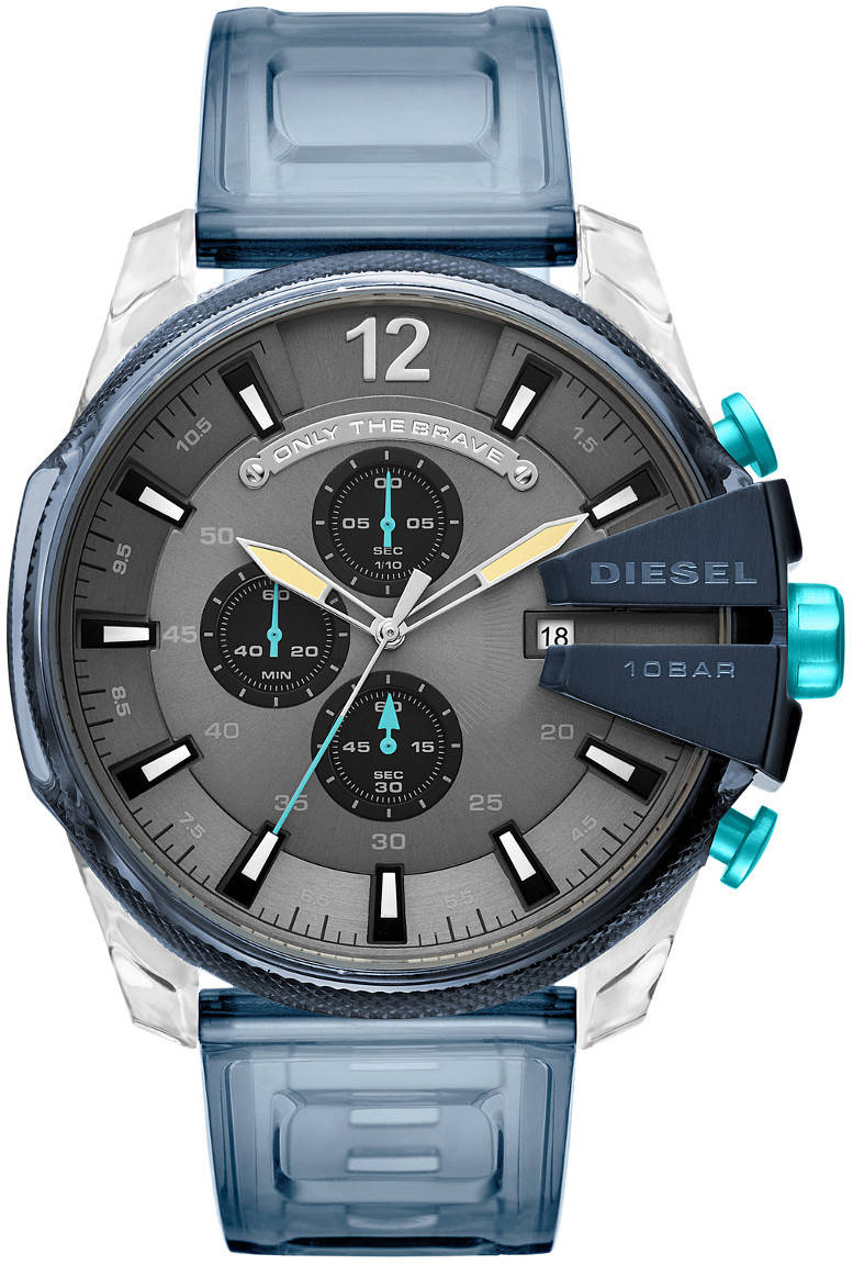 Diesel Mega Chief Chronograph DZ4487 -rannekello on ennennäkemätön yhdistelmä raikkaita värejä, läpikuultavia materiaaleja ja luovaa muotoilua. Sinisen sävyt näkyvät kellon rannekkeessa, rungossa, painikkeissa ja viisareissa. 26 mm leveä ranneke on valmistettu miellyttävän tuntuisesta kumista. Käteviä lisäominaisuuksia tässä mallissa ovat päivyri ja sekuntikello. Kellon runko on halkaisijaltaan 54 mm ja sen takakannessa komeilee Dieselin upea Only The Brave -mohikaanilogo.