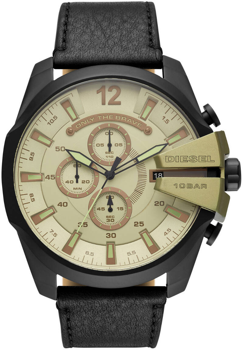 Diesel Mega Chief Chronograph DZ4495 -rannekellosta ei asennetta puutu. Jykevä oliivinvihreä kellotaulu ja leveä nahkaranneke suorastaan uhkuvat testosteronia. Tämä kello ei kuitenkaan ole pelkkää showta, vaan vakuuttaa myös ensiluokkaisilla ominaisuuksillaan ja materiaaleillaan. Kookas 52 mm runko on valmistettu ruostumattomasta teräksestä ja kestääkin vettä aina 100 m asti. Sekuntikello ja päivyri ovat myös näppärä lisä kellon työkalupakkiin. Takakannessa komeilee Dieselin upea Only The Brave -mohikaanilogo.