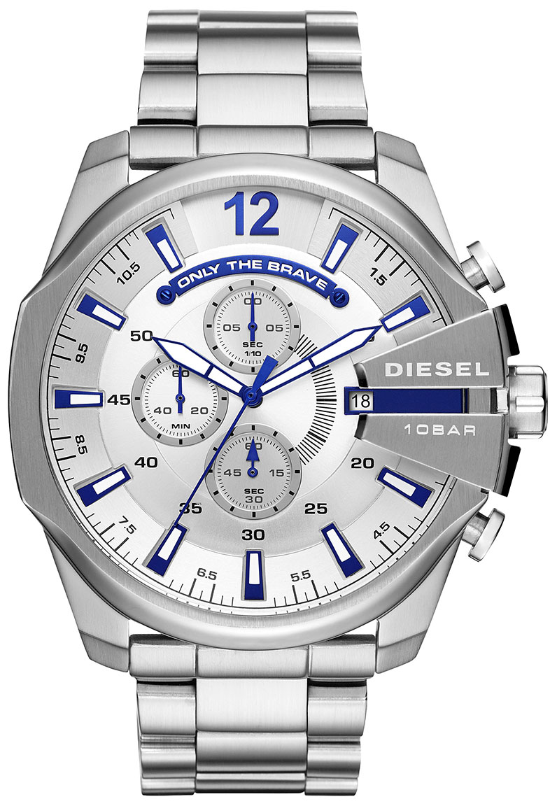 Diesel Mega Chief DZ4360 Chronograph on todella näyttävä hopeanvärinen rannekello. Kellon rungon leveys 51mm ja paksuus 13mm. Rannekkeen leveys kiinnityskohdasta 26mm. Ominaisuuksina ajanotto sekä päivyri. Diesel-kelloille myönnetään 2 vuoden takuu ja ne toimitetaan valmistajan alkuperäisessä rasiassa.