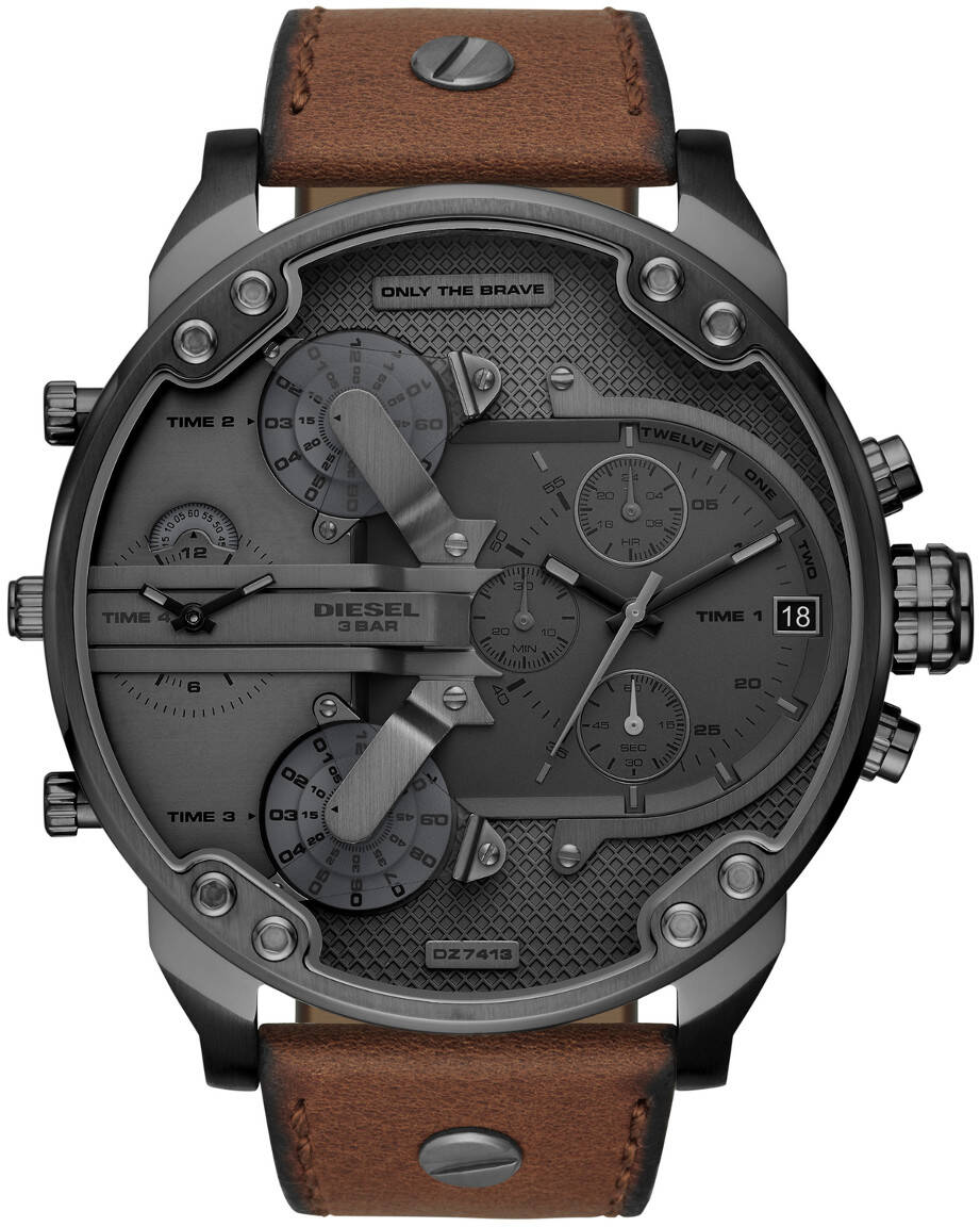 Diesel Mr. Daddy 2.0 Chronograph DZ7413 on todellinen kellojen kuningas. Massiivinen 57 mm runko pitää sisällään normaalin kellotaulun lisäksi sekuntikellon, päivyrin sekä kolme ylimääräistä kellotaulua valitsemiasi aikavyöhykkeitä vastaamaan. Mr. Daddy 2.0 on valmistettu ruostumattomasta teräksestä ja viimeistelty mineraalilasilla. Aidolla nahkarannekkeella on leveyttä 28 mm ja painoa koko komeudella 140 g. Kellon takakannesta löytyy Dieselin upea Only The Brave -mohikaanilogo.