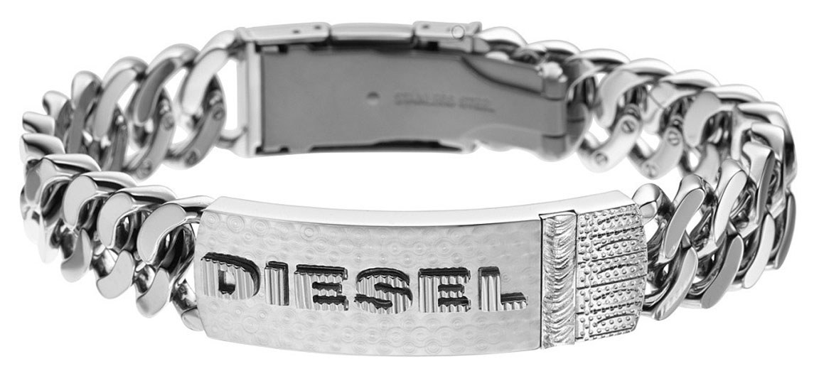 Hopeanvärinen ruostumattomasta teräksestä valmistettu Diesel DX0326040 on miehekäs rannekoru. Etupuolella laatassa DIESEL-logo. Korun pituus on 210 mm. Koru toimitetaan valmistajan alkuperäisessä pakkauksessa.