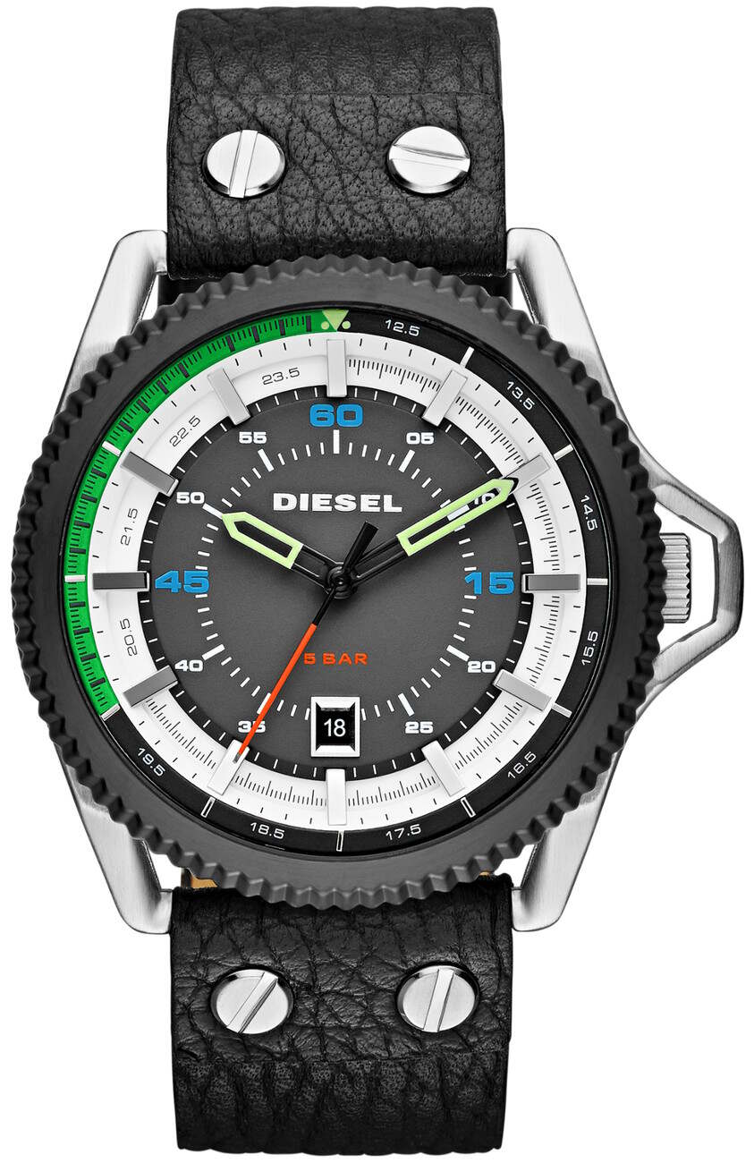 Diesel Rollcage DZ1717 on näyttävä rannekello. Mallissa on musta nahkaranneke. Kellon rungon leveys 46mm ja paksuus 13mm. Rannekkeen leveys kiinnityskohdasta 24mm. Diesel kelloille myönnetään 2 vuoden takuu ja ne toimitetaan valmistajan alkuperäisessä rasiassa.