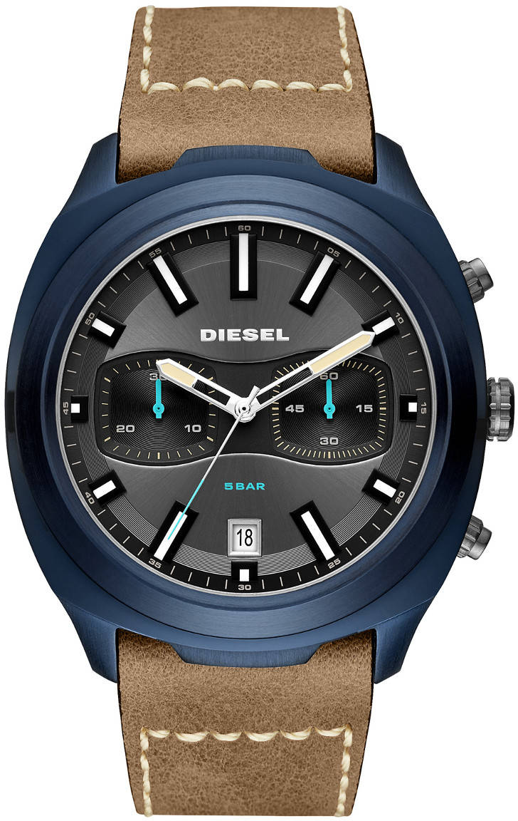 Diesel Tumbler Chronograph DZ4490 on sporttinen rannekello vauhdikkaaseen elämäntyyliin. 48 mm leveä ja 14 mm paksu teräsrunko on miehekkään tukeva ja sen takakannessa komeilee Dieselin upea Only The Brave -mohikaanilogo. Nahkarannekkeella leveyttä on 26 mm. Kellotaulusta löytyy persoonallisen muotoilun omaava sekuntikello sekä sen alapuolelle sijoitettu päivyri. Lisäksi kellon indeksit ovat luminoituvat.