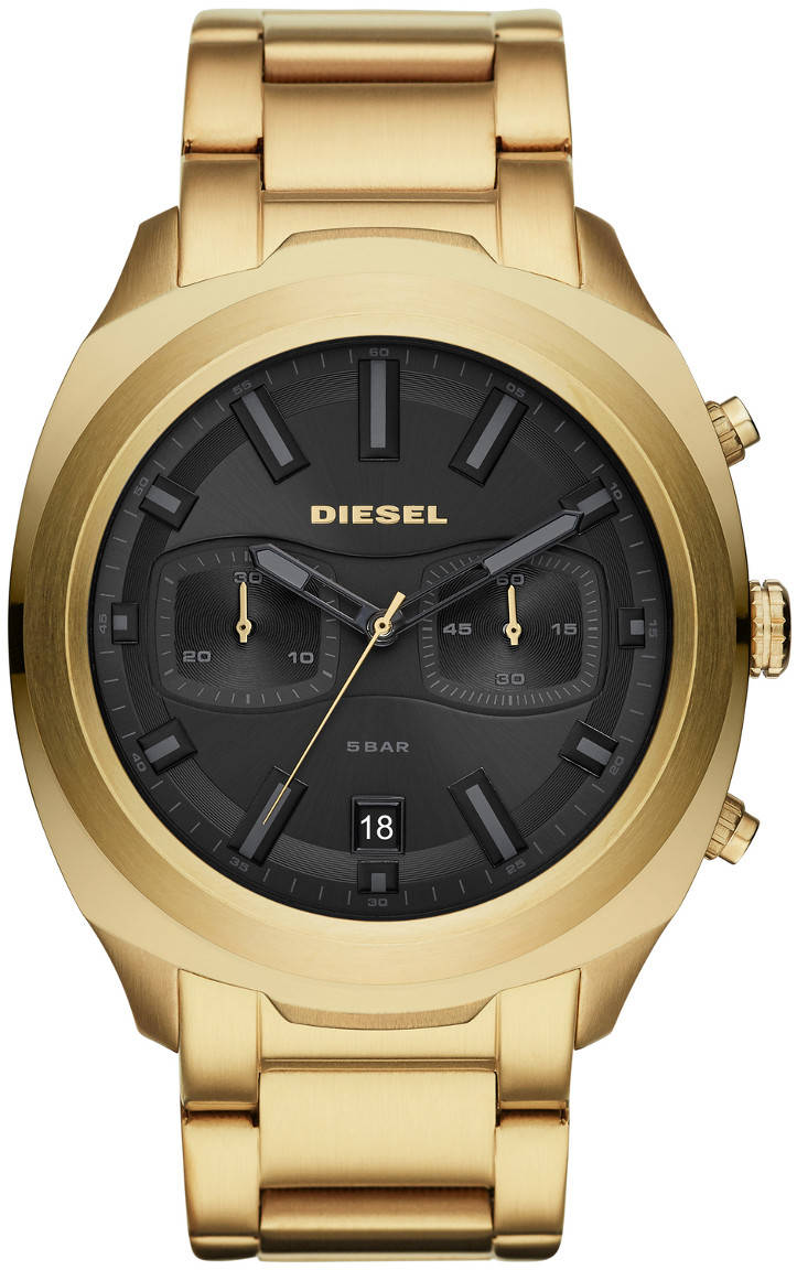 Näyttävän kullanvärinen Diesel Tumbler Chronograph DZ4492 on sporttinen rannekello vauhdikkaaseen elämäntyyliin. 48 mm leveä ja 14 mm paksu teräsrunko on miehekkään tukeva ja sen takakannessa komeilee Dieselin upea Only The Brave -mohikaanilogo. Rannekkeella leveyttä on 26 mm. Harmaan sävyihin verhoillusta kellotaulusta löytyy persoonallisen muotoilun omaava sekuntikello sekä sen alapuolelle sijoitettu päivyri.