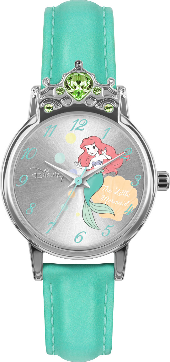 Lasten Disney D5105P -rannekellossa esiintyy Pieni merenneito -elokuvasta tuttu Ariel. Kellon runko on halkaisijaltaan 30 mm ja sen yläosa on muotoiltu kruunuksi, jossa kimaltavat kirkkaan vihreät zirkoniat. 14 mm leveä ranneke on valmistettu mukavan pehmeästä nahasta. Kaikille Disney-kelloille myönnetään kahden vuoden takuu ja ne toimitetaan valmistajan alkuperäisessä pakkauksessa.