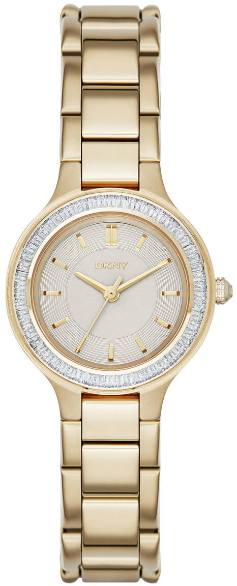 DKNY Chambers NY2392-rannekello on kauniisti säihkyvä teos! Kellon runko ja turvalukollinen ranneke ovat valmistettu kullan väriseksi pinnoitetusta ruostumattomasta teräksestä. Kauneuden kruunaa mineraalilasilla suojattu ja korukivin koristeltu shampanjan värinen kellotaulu. Kellon rungon leveys on 29.6mm ja paksuus 10mm. Rannekkeen leveys kiinnityskohdassa on 14mm. DKNY kelloille myönnetään kahden vuoden takuu ja ne toimitetaan valmistajan alkuperäisessä pakkauksessa.