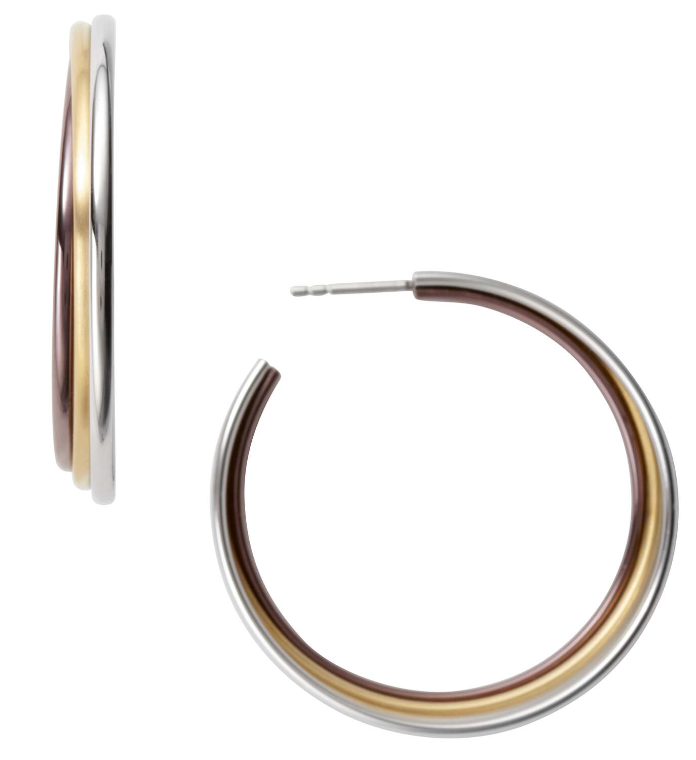 Naisten DKNY NJ1863040 rengaskorvakoruissa on tappikiinnitys. Korvakorut ovat valmistettu ruostumattomasta teräksestä, jossa on kulta- sekä pronssipinnoite. Korvakorujen halkaisija on 3,8 cm. Tuote toimitetaan valmistajan alkuperäisessä rasiassa.