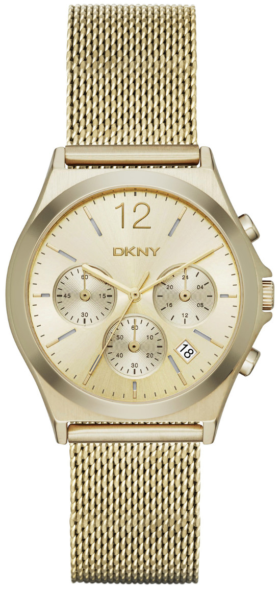 DKNY Parsons Chronograph NY2485 on säihkyvä kullanvärinen naisten kello, joka on valmistettu ruostumattomasta teräksestä. Tässä mallissa on mukana sekuntikello, 24 h taulu ja päivyrinäyttö. Rungon halkaisija on 38 mm ja rannekkeen leveys 20 mm.