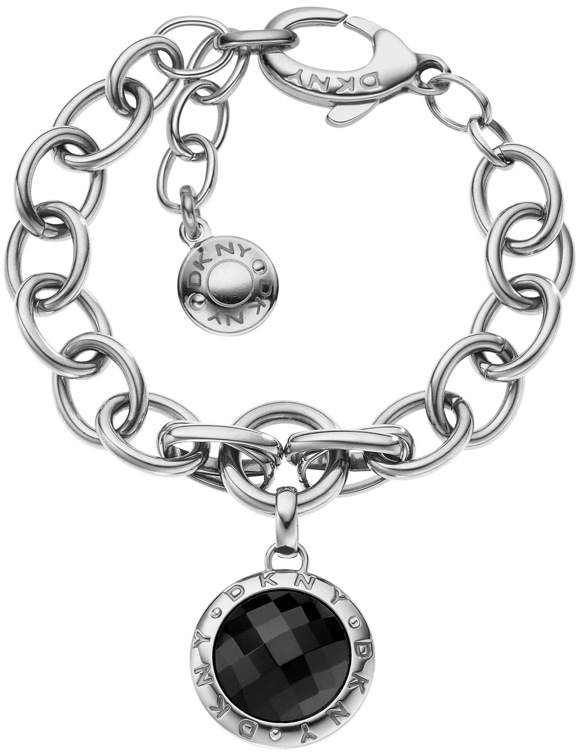 Tässä rannekorussa on käytetty hopeaksi värjättyä ruostumatonta terästä. Koru muodostuu ketjusta, joka kannattelee metallipohjalla olevaa mustaa lasia. Metalliin on kirjailtu DKNY. Koru on sopiva vapaa-aikaan kuin myös illanviettoon. Ketjun pituus on 210 mm. Kaikki DKNY-korut toimitetaan valmistajan alkuperäisessä lahjapakkauksessa.