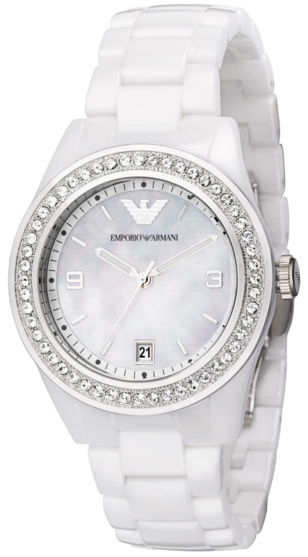 Naisten Emporio Armani AR1426 rannekello. Kellon valkoinen runko ja ranneke ovat keraamiset. Rannekkeen leveys on 18mm ja rungon 40mm. Kellossa on myös päivyri. Taulun ulkokehälle upetetut koristekivet antavat kellolle tyylikkään ilmeen. Emporio Armani kelloille myönnetään 2 vuoden takuu ja ne toimitetaan valmistajan alkuperäisessä rasiassa.