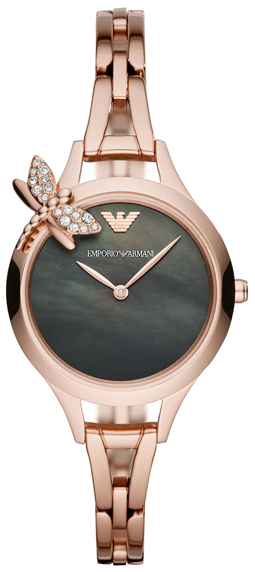 Naisten Emporio Armani Aurora AR11139-korukellossa on ruusukullanvärinen teräsrunko ja ranneke, ja kellotaulua koristaa aito musta helmiäistausta. Ripauksen luksusta kellolle antaa runkoon istutettu kristallikoristeltu sudelkorento. Rungon leveys on 32 mm, ja 10 mm leveän rannekkeen ansiosta kello on kevyt ranteessa. Emporio Armani-kelloilla on 2 vuoden takuu, ja ne toimitetaan valmistajan alkuperäisessä pakkauksessa.