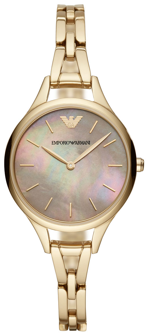 Naisten Emporio Armani Aurora AR11140-korukellossa on kullanvärinen teräsrunko ja ranneke, ja kellotaulua koristaa aito helmiäistausta, joka antaa kellolle ripauksen luksusta. Rungon leveys on 32 mm, ja 10 mm leveän rannekkeen ansiosta kello on kevyt ranteessa. Emporio Armani-kelloilla on 2 vuoden takuu, ja ne toimitetaan valmistajan alkuperäisessä pakkauksessa.