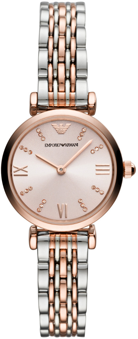Kaksivärinen Emporio Armani Gianni T-Bar AR11223 -rannekello on malliesimerkki legendaarisesta Armani-viehätyksestä. Kellossa on kaunis ruusukullansävyinen kellotaulu, jonka indeksit on korvattu kristallein. Osoittimet on ruusukullansävyiset ja ruusukullan sävy jatkuu kellokehään ja rannekkeeseen. Kello on valmistettu laadukkaasta ruostumattomasta teräksestä. Tässä sirossa mallissa rungon halkaisija on 32 mm ja rannekkeen leveys 14 mm. Kaikille Emporio Armani -kelloille myönnetään 2 vuoden takuu ja ne toimitetaan valmistajan alkuperäisessä rasiassa.