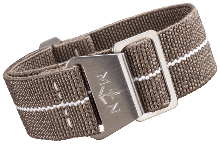 Erika's Originals Shamal MN™ White on tyylikäs ja kestävä armeijahenkinen tekstiiliranneke, jota on saatavilla 18mm, 20mm, 22mm ja 24mm levyisenä. Ranneke on helposti säädettävissä sopivan kokoiseksi, ja se sopiikin ranteeseen, jonka ympärysmitta on 165-195 mm. Ruskeaa ranneketta koristaa valkoinen raita. Laadukkaasta nailonista valmistetut käsintehdyt tekstiilirannekkeet ovat todella miellyttäviä ranteeseen. Shamal MN™ White -rannekkeen solki on valmistettu 316 ruostumattomasta teräksestä. Erika's Originals MN™ -kellorannekkeet sopivat hyvin allergikoille, sillä niissä ei ole lainkaan lateksia.
