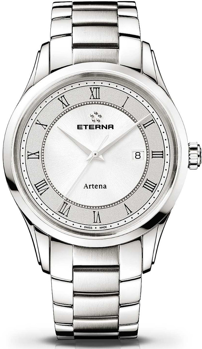 Sveitsiläisessä Eterna Artena 2520.41.55.0274 -rannekellossa on huippulaadukas ETA 955.412 -paristokoneisto. Tämä miesten malli on valmistettu ruostumattomasta teräksestä ja sen runko on leveydeltään 40 mm. Hopeanväristä kellotaulua suojaa heijastamaton safiirilasi. Mukana lisäksi kätevä päivyrinäyttö.