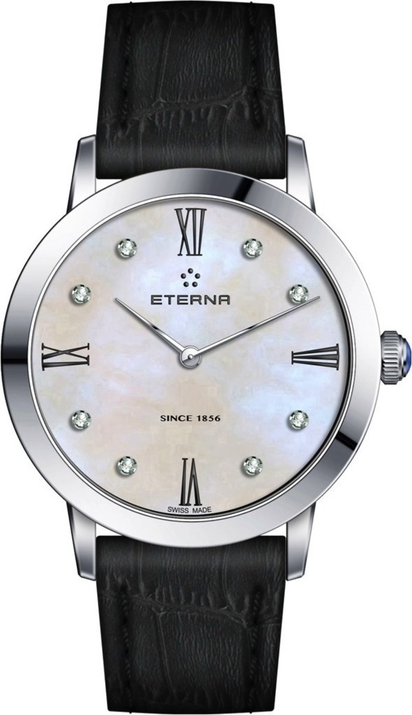 Sveitsiläisessä Eterna Eternity Lady 2720.41.66.1386 -rannekellossa on huippulaadukas ETA 956.412 -paristokoneisto. Tämä tyylikäs naisten malli on 32 mm leveä ja valmistettu ruostumattomasta teräksestä. Kellon kellotauluun on istutettu 8 timanttia ja helmiäispintaista kellotaulua suojaa heijastamaton safiirilasi.