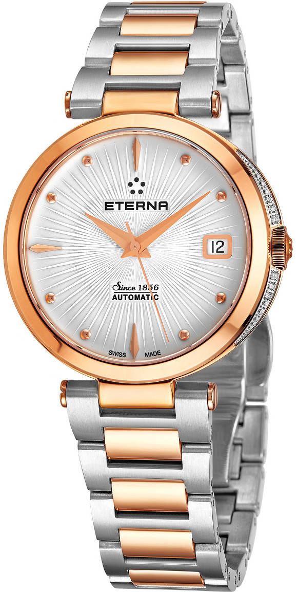 Sveitsiläisessä Eterna Grace 2944.55.66.1711 -rannekellossa on 25-kivinen Sellita SW300-1 automaattikoneisto, joka värähtelee 28 800 kertaa tunnissa. Koneiston käyntivara on 42 h. Tämä elegantti naisten malli on valmistettu ruostumattomasta teräksestä ja sen runko on leveydeltään 36 mm. Säätönupin ylä- ja alapuolella säteilee yhteensä kuusi kirkasta timanttia. Valkoista kellotaulua suojaa heijastamaton safiirilasi. Mukana lisäksi kätevä päivyrinäyttö.