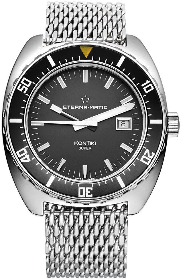 Eterna Super Kontiki Limited Edition 1973 1973.41.41.1230. Kelloa on valmistettu 1973 kappaleen rajoitettu numeroitu erä. Tämä kello on numeroltaan 1476. Koneiston tässä kellossa on ETA2824-2 automaattikoneisto. Kellon rungon leveys on 44mm. Kellossa on laadukas mesh-ranneke ja siihen tulee mukaan jatko-osa, jotta kellon voi pukea myös sukelluspuvun päälle. Eterna kelloille myönnetään 2 vuoden takuu ja ne toimitetaan valmistajan alkuperäisessä rasiassa.