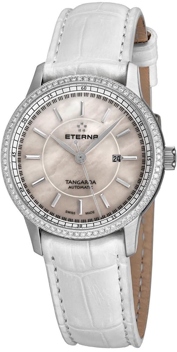 Sveitsiläisessä Eterna Tangaroa Lady Date 2947.50.61.1293 -rannekellossa on 25-kivinen ETA 2671 -automaattikoneisto, joka värähtelee 28 800 kertaa tunnissa. Koneiston käyntivara on 38 h. Tässä tyylikkäässä naisten mallissa runko on 32 mm leveä ja valmistettu ruostumattomasta teräksestä. Valkoinen ranneke on materiaaliltaan aitoa nahkaa ja helmiäiskellotaulua suojaa heijastamaton safiirilasi. Kellon kehää kiertävät upean kirkkaat timantit (78 kpl). Mukana lisäksi kätevä päivyrinäyttö.