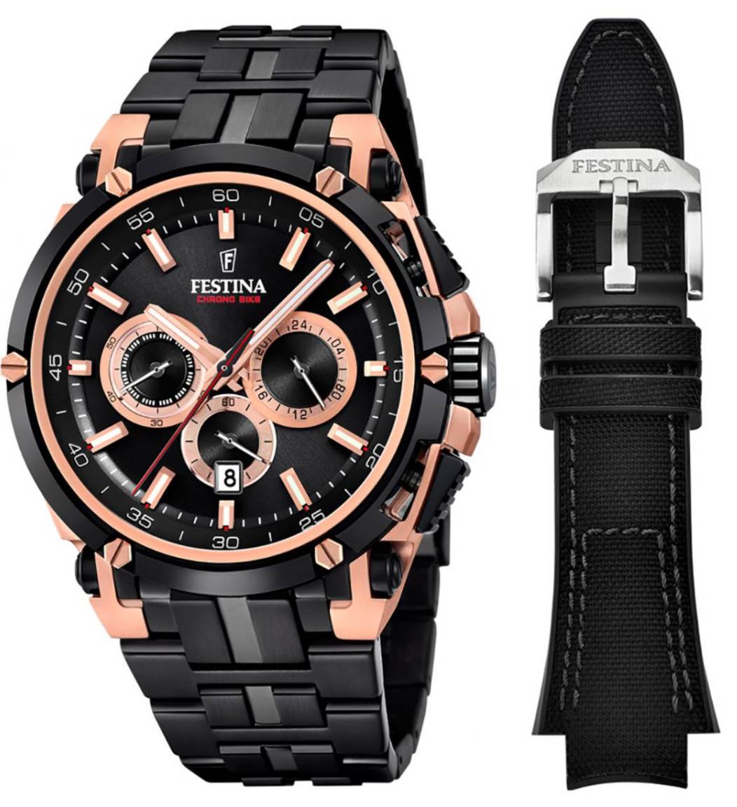 Festina Chrono Bike 2017 Special Edition F20329/1 kuuluu Festinan suosittuun jokavuotiseen Chrono Bike sarjaan. Tämä malli on vuoden 2017 Limited Edition malli, jota on valmistettu vain rajoittettu erä. Tässä mallissa on punakullan värinen runko ja musta teräsranneke. Ominaisuuksina ajanotto sekä päivyri. Lisäksi kellon mukana toimitetaan musta kumiranneke, jolle on oma paikka kellon lahjarasiassa. Festina kelloille myönnetään 2 vuoden takuu ja ne toimitetaan valmistajn alkuperäisessä rasiassa.