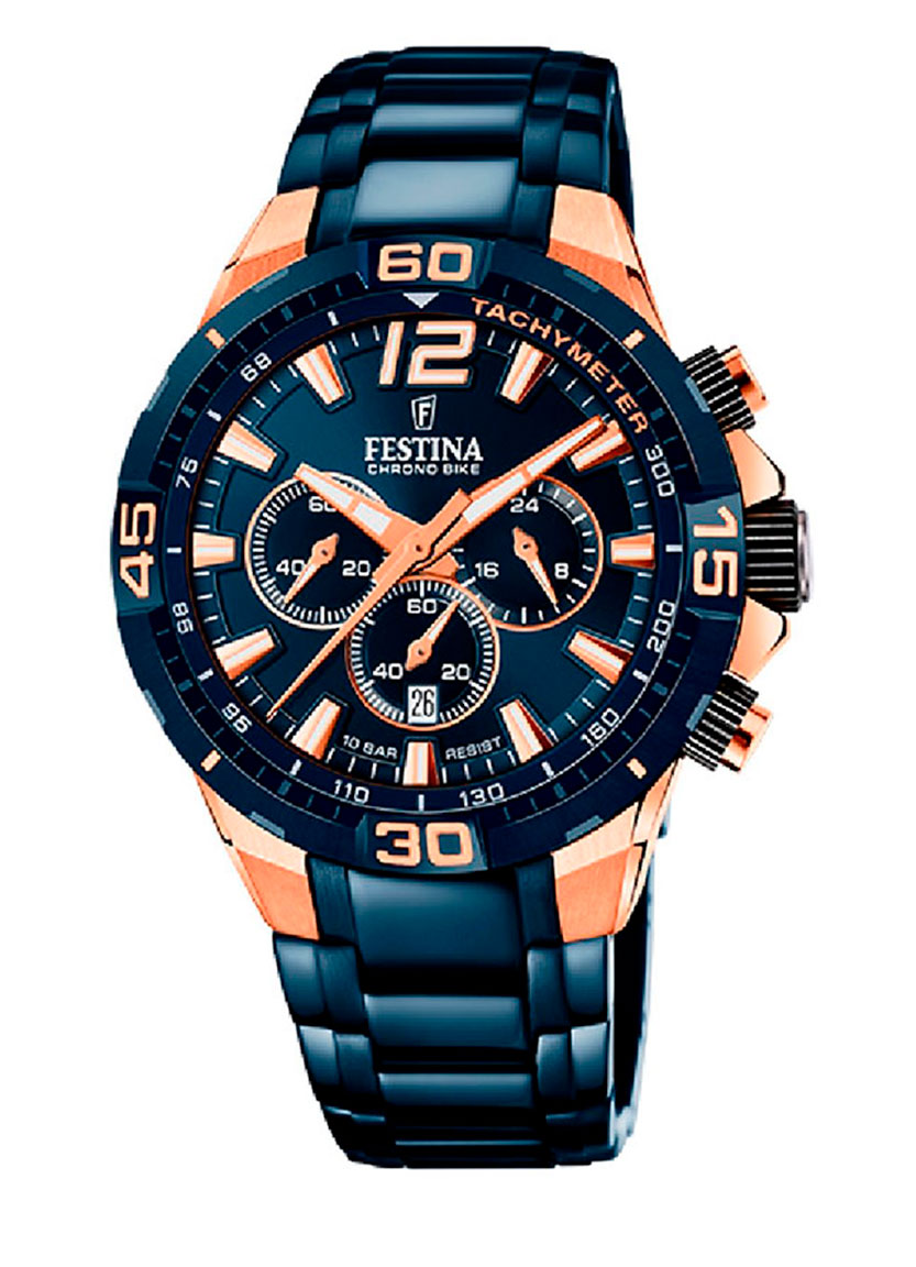 Festina Chrono Bike F20524/1 -kellossa on ajanotto-ominaisuus. Kello on valmistettu ruostumattomasta teräksestä ja siinä on sininen teräsranneke linkkulukolla. Runko on punakultainen sinisillä yksityiskohdilla ja kellotaululla. Indeksit ja osoittimet ovat punakultaiset sekä luminoidut. Rungon leveys on 45 mm ja paksuus 13 mm. Rannekkeen leveys on 14 mm. Ominaisuutena on ajanoton lisäksi myös päivyri. Kellon mukana tulee lisäksi silikoninen vaihtoranneke. F20524/1-kellon vesitiiviysluokitus on 100m / 10atm eli soveltuu pintauintikäyttöön ja snorkkelisukellukseen, ei laitesukellukseen. Festina-kelloille myönnetään 2 vuoden takuu, ja ne toimitetaan valmistajan alkuperäisessä.