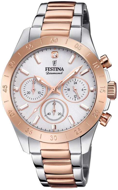Festina Diamond Chronograph F20398/1 on todella tyylikäs naisten kello. Tähän kelloon särmää tuovat kaksivärinen design, kello kahdessatoista loistava timantti sekä luminoituvat indeksit. Kello on valmistettu ruostumattomasta teräksestä ja se kädessä voit huoletta pulahtaa uimaan. Myös mineraalilasi lisää kestävyyttä ja sekuntikellon avulla ajanottokin sujuu vaivattomasti. Mitat 39 mm (runko) ja 18 mm (ranneke kiinnityskohdasta).