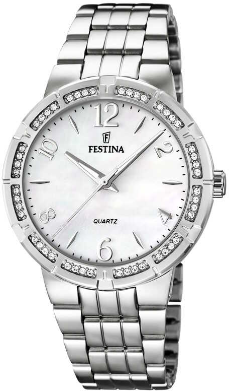 Naisten upea Festina F16703/1 rannekello. Kellon rungon leveys on 36mm ja rannekkeen leveys 16mm. Runko ja ranneke on valmistettu ruostumattomasta teräksestä ja ovat hopean väriset. Kellossa on tyylikäs helmiäinen taulu. Kellon ulkokehälle on upotettu zirkonia-koristekiviä. Festina kelloille myönnetään kahden vuoden takuu ja ne toimitetaan valmistajan alkuperäisessä rasiassa.