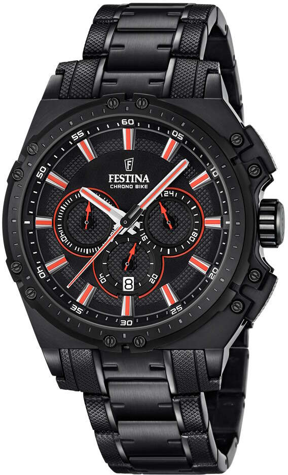 Festina F16969/4 Chrono Bike 2016 kuuluu Festinan jokavuotiseen Chrono Bike sarjaan. Tässä mallissa on kokomusta runko sekä ranneke ja punaiset indeksit ja viisarit. Ominaisuuksina ajanotto sekä päivyri. Kellon rungon leveys on 44mm ja rannekkeen leveys 21mm. Rungon paksuus 13mm. Festina kelloille myönnetään 2 vuoden takuu ja ne toimitetaan valmistajan alkuperäisessä rasiassa.