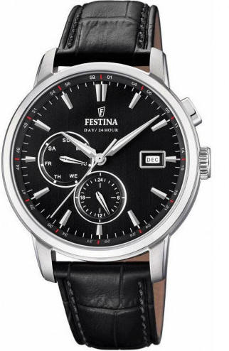Festina Multifunction F20280/4-rannekellon avulla olet aina oikeassa paikassa oikeaan aikaan. Kellossa on suuri kirkas 41 mm leveä teräsrunko ja krokotiilikuvioitu ranneke. Mustassa kellotaulussa on analogisen kellon lisäksi on erillinen päivämäärä- ja kuukausinäyttö ja 24 tunnin kello. Kellon teräsviisarit on luminoitu ja ne hohtavat pimeässä. Rannekkeen kiinnityskohdan leveys on 20 mm:iä. Candino-kelloille myönnetään 2 vuoden takuu ja ne toimitetaan valmistajan alkuperäisessä pakkauksessa.