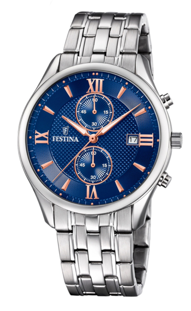 Festina Retro Chronograph F6854/5-kello on moderni versio Festinan perinteikkäämmistä kellomalleista. Siinä on monipuoliset ominaisuudet, kuten päivyri ja sekuntikello, ja sinisävyistä kellotaulua somistaa ruusukullansävyiset osoittimet. Kellon ranneke on valmistettu ruostumattomasta teräksestä. Runko on leveydeltään on 41mm ja sen paksuus on 11mm. Rannekkeen kiinnityskohdan leveys on 21mm. Festina kelloilla on 2 vuoden takuu, ja ne toimitetaan valmistajan alkuperäisessä rasiassa.