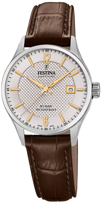 Festina Swiss made capsule collection-malliston myötä Festina palaa juurilleen Sveitsiin. Festina Sapphire Ladies Swiss made capsule F20009/2 on täysin sveitsiläisvalmisteinen ja Rondan Quartz-koneiston ja kellotaulua suojaavan safiirilasin ansiosta tässä kellossa on loistava hinta-laatusuhde. Kellon muotoilun juuret on alkuperäisissä Festina-kelloissa, jonka vuoksi tämä vintage-henkinen kello kestää aikaa ja pysyy aina tyylikkäänä. Kellossa on ruostumaton 28 mm:iä leveä ruostumaton teräsrunko, kastanjanruskea krokotiilikuvioitu nahkaranneke ja sen pehmeässä vaaleanruskeassa kellotaulussa on kullanväriset teräsviisarit ja indeksit. Kolmannen indeksin kohdalla on päivyri. Rannekkeen kiinnityskohdan leveys on 14 mm:iä.