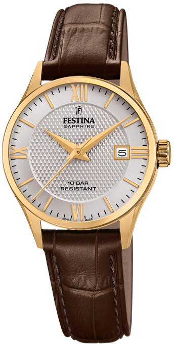 Festina Swiss made capsule collection-malliston myötä Festina palaa juurilleen Sveitsiin. Festina Sapphire Ladies Swiss made capsule F20011/2 on täysin sveitsiläisvalmisteinen ja Rondan Quartz-koneiston ja kellotaulua suojaavan safiirilasin ansiosta tässä kellossa on loistava hinta-laatusuhde. Kellon muotoilun juuret on alkuperäisissä Festina-kelloissa, jonka vuoksi tämä vintage-henkinen kello kestää aikaa ja pysyy aina tyylikkäänä. Kellossa on ruostumaton 28 mm:iä leveä ruostumaton kullanvärinen teräsrunko, kastanjanruskea krokotiilikuvioitu nahkaranneke ja sen pehmeässä vaaleanruskeassa kellotaulussa on kullanväriset teräsviisarit ja indeksit. Kolmannen indeksin kohdalla on päivyri. Rannekkeen kiinnityskohdan leveys on 14 mm:iä.