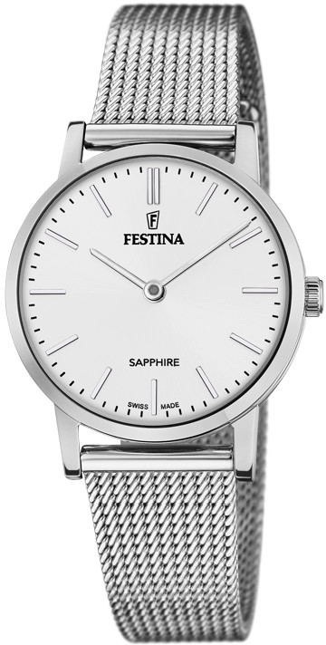 Festina Swiss Made F20015/1 -rannekellossa on ruostumaton 29,5 mm:iä leveä ruostumaton teräsrunko ja näyttävä mesh-teräsranneke. Kello on saanut ilmeensä Festinan alkuperäisistä kellomalleista ja siinä on valkoinen kellotaulu. Rungon paksuus on vain 6,7 mm ja rannekkeen leveys kiinnityskohdasta 15 mm. Festina kelloille myönnetään 2 vuoden takuu ja ne toimitetaan valmistajan alkuperäisessä rasiassa.