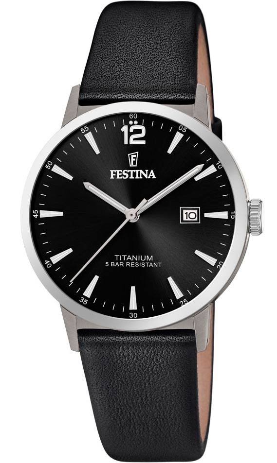 Festina Titanium F20471/3-kello on yksinkertaisen tyylikäs kokonaisuus, jossa on musta kellotaulu hopeanvärisessä titaanirungossa ja pehmeä nahkaranneke. Rungon leveys on 40mm ja paksuus 9mm, ja rannekkeen kiinnityskohdan leveys on 21mm. Kellossa on lisätoimintona päivyri. Festina-kelloilla on 2 vuoden takuu, ja ne toimitetaan valmistajan alkuperäisessä rasiassa.