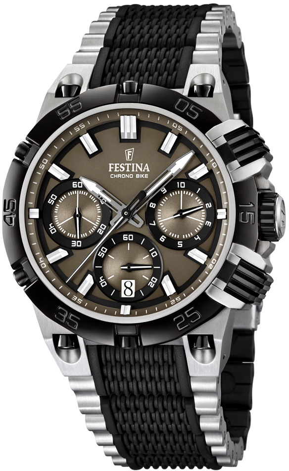 Festina Tour De France 2014 F16775/3. Tour de France mallisto tunnetaan myös nimellä Festina Chrono Bike. Kellot ovat Festinan ja maailmankuulun Tour de France pyöräkilpailun yhteistyön tulosta. Kellon rungon leveys on 44mm ja kellossa on ajanotto sekä päivyri. Kellolla on kahden vuoden takuu. Tuote toimitetaan valmistajan alkuperäisessä Tour De France rasiassa.