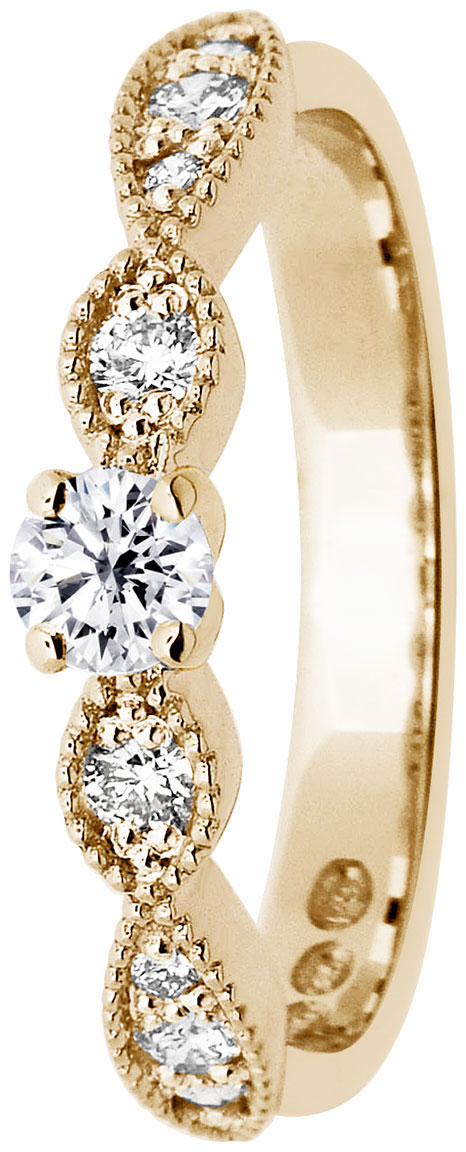 Edith on Festiven kaunis sivukivellinen timanttisormus, jonka on muotoillut Marko Osala. Sormus on valmistettu lämpimän sävyisestä keltakullasta, jonka karaateiksi voit valita joko 14k tai 18k (sama sormus on myös saatavilla valko- ja punakultaisena). Monikivistä vihkisormusta koristaa 9 laadukasta Wesselton-timanttia, jotka on hiottu briljantti-hionnalla. Timantit ovat kooltaan 0.19ct + 4x0.03ct + 4x0.01ct ja täyttävät SI-luokan puhtausskaalalla. Sormuksen leveys on 3mm.