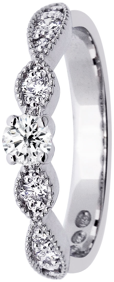 Festiven kaunis Esther-sormus on Marko Osalan suunnittelema kaunis vintage-henkinen timanttisormus. Sormusta koristaa 9 kirkasta Wesselton-timanttia, jotka ovat kooltaan 0.19ct + 4x0.03ct + 4x0.01ct. Timantit on hiottu klassisella briljantti-hionnalla ja täyttävät SI-luokan. Sormuksessa on käytetty laadukasta hopean hohtoista valkokultaa, jonka karaateiksi voit valita joko 14k tai 18k (samasta sormuksesta on myös olemassa kelta- ja punakultaversiot). Sormus on leveydeltään 3mm.