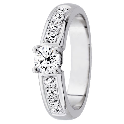 Festiven ylelliseen Luxury-mallistoon kuuluva Eva-timanttisormus tarjoaa timanttien loistetta. Sormusta koristaa yhdeksän näyttävää Wesselton-timanttia. Suurin timantti on kooltaan 0.4ct ja sitä reunustaa kahdeksan 0.02ct tuikkivaa timanttia. Timantit on hiottu briljantti-hionnalla, jolla saadaan korostettua timanttien säihkettä. Korun runko on hopean väristä valkokultaa, jonka karaateiksi voit valita joko 14K tai 18K. Samasta sormuksesta on saatavilla myös keltakultainen versio. Sormuksen leveys on 4,5mm.
