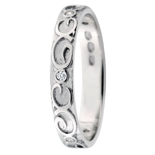 Kotimaisen Festiven Figure-sormus kuuluu persoonalliseen New Style-mallistoon. Korua koristaa kaunis köynnösmäinen kuviointi, jonka lomaan on istutettu viisi 0.01ct kirkasta Wesselton-timanttia. Sormuksen timantit on hiottu klassisella briljantti-hionnalla ja ne täyttävät korkeatasoisen SI-luokan puhtausasteikolla. Sormuksen runko on hopean hohtoista valkokultaa, jonka karaateiksi voit valita 14K tai 18K. Samasta sormuksesta löydät valikoimastamme myös keltakultaversion. Sormuksen leveys on 3mm