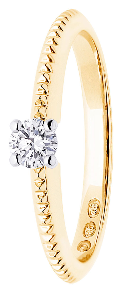 Sormuksen runko on keltakultaa, mutta timantin istutuksessa on käytetty valkokultaa, jolla korostetaan jalokiven loistoa. Voit valita koruusi joko 14K tai 18K kullan. Siro sormus on leveydeltään 2,2mm.