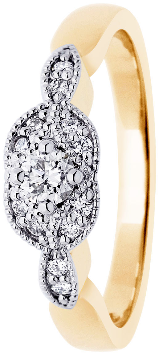 Lavender-sormus on yksi Festiven suositun vintage-malliston timanttisormuksista. Marko Osalan muotoilemaa vintage-henkistä timanttisormusta koristaa kaunis halo-asetelma. Koruun on upotettu kaksitoisa 0.01ct ja yksi 0.15ct kirkasta Wesselton-timanttia. Kivet on hiottu klassisella briljantti-hionnalla, joka takaa niiden kauniin säihkymisen valossa. Sormus on leveydeltään rungon kohdalta 3mm ja timanttien kohdalta 5.5mm. Sormuksessa on yhdistelty kelta- ja valkokultaa, joiden karaateiksi voit valita joko 14K tai 18K (sama koru on saatavilla myös valko- ja punakultaisena).