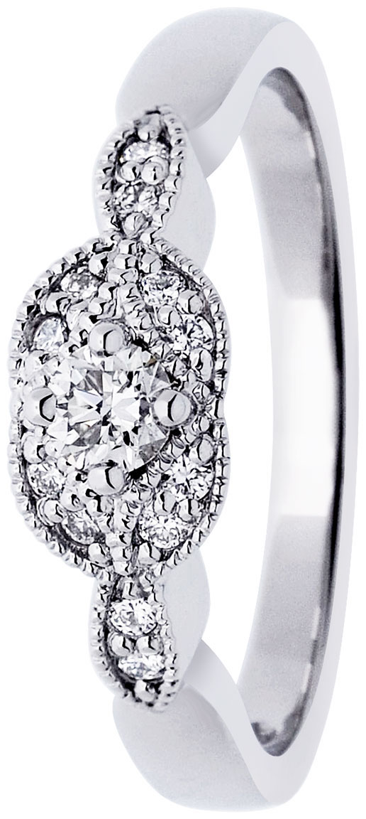 Festiven Lavendersormusta koristaa kaunis vintage-henkinen halo-astelema. Asetelmaan on upotettu kaksitoista 0.01ct ja yksi 0.15 kirkasta Wesselton-timanttia. Timantit on hiottu perinteisellä briljantti-hionnalla ja täyttävät puhtausasteikolla SI-luokan. Sormuksen leveys on rungon kohdalta 3mm ja timanttien kohdalta 5.5mm. Korun valkokulta on saatavilla joko 14K tai 18K versiona (samasta korusta on olemassa myös keltakultainen ja punakultainen versio). Marko Osalan suunnittelema persoonallinen Lavender-sormus on osa Festiven suosittua vintage-mallistoa.