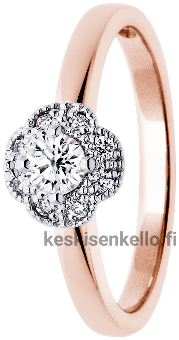 Festiven punakultainen Linnea-sormus on kaunis katseet vangitseva halo-sormus. Marko Osalan muotoilema sormus on tyyliltään vintage-henkinen. Timantti sormus on rungon kohdalta leveydeltään 2.2mm ja timanttien kohdalta 7.3mm. Koruun on upotettu 8x0.01ct ja 1x0.22ct kirkasta Wesselton-timanttia, jotka on hiottu perinteisellä briljantti-hionnalla. Briljantti-hionnalla maksimoidaan kivien loiste valossa, mikä saa korun säihkymään. Sormus on valmistettu laadukkaasta punakullasta, jonka karaateiksi voit valita joko 14K tai 18K (sama sormus saatavilla myös kelta- ja valkokultaisena).