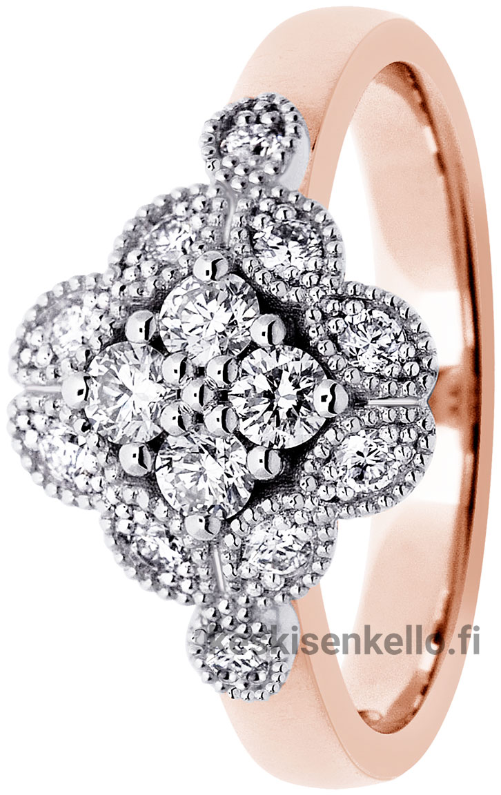 Näyttävä Festiven Lotus-sormus on Marko Osalan suunnittelema kaunis vintage-henkinen timanttisormus. Sormuksen uniikki timanttiasetelma kiinnittää katseita loisteellaan. Sormukseen on istutettu 10 0.2ct ja 4 0.7ct kirkasta Wesselton-timanttia, jotka on hiottu klassisella briljantti-hionnalla. Punakultaisen sormuksen karaateiksi voit valita 14K tai 18K (sormuksesta on olemassa myös keltakultainen ja valkokultainen versio). Sormus on rungon kohdalta leveydeltään 2.8mm ja kivien kohdalta 11mm. Lotus sormus kuuluu Festiven vuoden 2018 uutuuksiin.