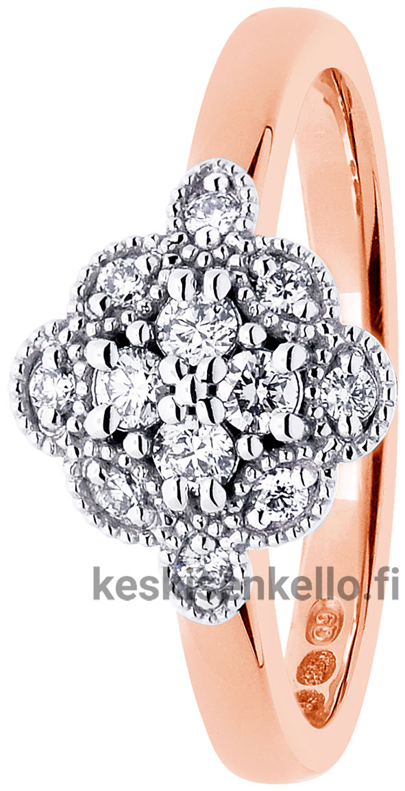 Festiven Lotus-sormuksen näyttävänä yksityiskohtana toimii kaunis vintage-henkinen timanttiasetelma. Marko Osalan muotoilemassa sormuksessa yhdistyy kauniisti perinteinen korumuotoilu ja ajankohtaisen materiaalivalinnat. Sormuksen punakulta on saatavilla joko 14K tai 18K versiona (sama sormus on saatavilla kelta- tai valkokultaisena). Sormus on leveydeltään 2.5mm rungon kohdalta ja 9.8mm timanttien kohdalta. Sormukseen on istutettu neljä 0.03ct ja 8 0.01ct kirkasta Wesselton-timanttia. Timantit on hiottu klassisella briljantti-hionnalla, jolla saadaan maksimoitua kivien loiste valossa.