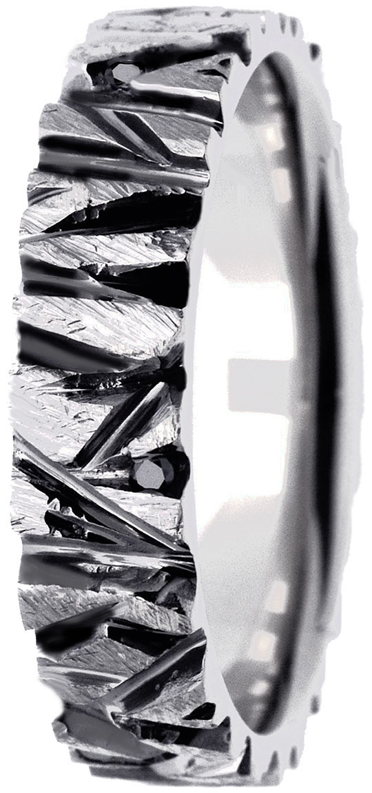 Festiven Rautapuumalliston sormuksen ovat muotoilultaan moderneja ja sopivat erityisesti heille, jotka haluavat koruunsa uniikimman muotoilun. Monikivinen hopean sävyinen sormus on saatavilla joko 14K tai 18K valkokullasta. Sormusta koristaa 6 briljantti-hiottua mustaa Fancy Black-timanttia. Timantit ovat kooltaan 0.01ct ja upotettu sormuksen kauniin pintaa koristavan kuvioinnin lomaan. Sormus on leveydeltään 5mm.