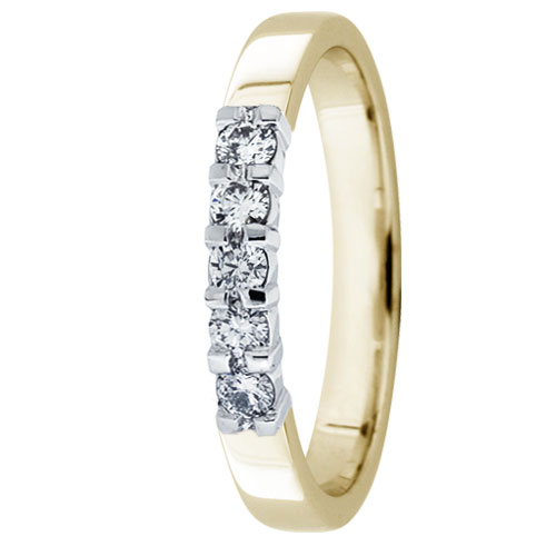 Sophia-sormus on kaunis rivitimanttisormus, jota koristaa säihkyvä viiden 0.05ct kiven timanttirivi. Timantit ovat kirkkaita Wesselton-timantteja, joiden kirkkautta korostaa niiden SI-luokan täyttävä puhtaus. Korun kivet on hiottu briljantti-hionnalla, jota käytetään loisteen maksimoimiseksi. Sormuksen runko on leveydeltään 2,8mm ja siinä on käytetty sekä kelta- että valkokultaa. Käyttämällä valkokultaa timanttien istutuksen kohdalta, saadaan korostettua niiden kokoa ja loistoa. Korun jalometallien karaateiksi voit valita joko 14K tai 18K. Samasta sormuksesta on saatavilla myös hopean sävyinen valkokultaversio.