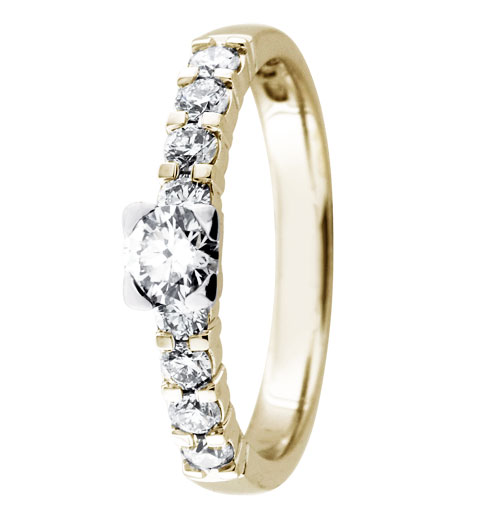 Suositun kotimaisen Festiven kaunis Sophia Solitaire-sormus on oikea valinta hänelle, joka hakee säihkettä ja näyttävyyttä. Sormuksessa silmän vangitsee suuri 0.27ct sormus, jota reunustaa kaunis kahdeksan 0.05ct timantin rivi. Sormuksen timantit on hiottu klassisella briljantti-hionnalla, jolla saadaan maksimoitua jalokivien säihke. Timantit ovat kirkkaita Wesselton-timantteja, ja ne täyttävät puhtausskaalalla SI-luokan. Sormuksen runko on muotoiltu laadukkaasta keltakullasta, jonka karaateiksi voit valita joko 14K tai 18K. Samasta sormusmallista on olemassa myös tyylikäs valkokultaversio, sekä versio jossa on käytetty sekä kelta- että valkokultaa. Sormus on leveydeltään 2,8mm.