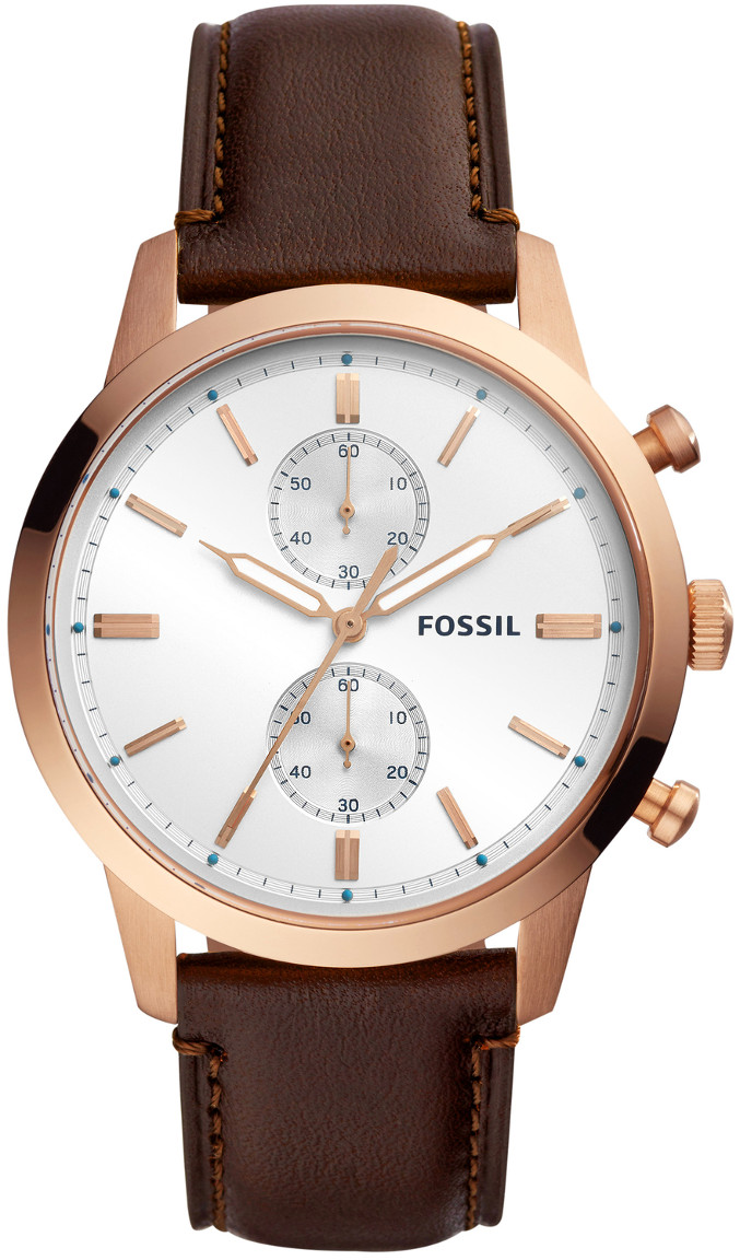 Fossilin suosittu Townsman-mallisto ei juuri esittelyjä kaipaa. Tämä FS5468-kronografi kietoutuu ranteen ympärille tummanruskealla, aidolla nahkarannekkeellaan ja loistaa pimeässä kirkkaasti luminoituvilla viisareillaan. Kupera mineraalilasi suojaa kellotaulua, josta löytyvät omat kehänsä sekä sekuntien että minuuttien mittaamiseen. Kellon runko on ruostumatonta terästä ja leveydeltään 44 mm.
